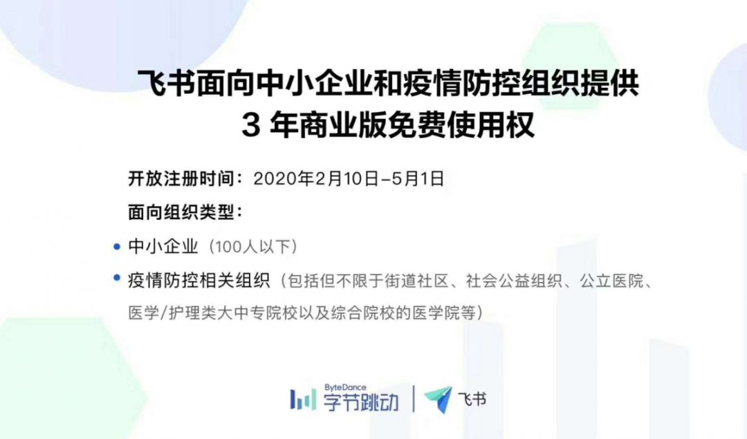 在这个特殊时期,一些中小企业面临挑战,而公益机构、医院等组织仍奋战在抗疫第一线,需要好的协作产品来提高运转效率。因此,飞书针对2020年2月10日-5月1日期间,申请并注册的中小企业(100人以下)、街道社区、公益组织、医院和医学类院校等组织,免费提供3年商业版免费权益。